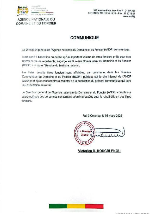 L’Agence Nationale du Domaine et du Foncier (ANDF) tire la sonnette d’alarme. Dans un communiqué publié ce mardi 03 mars 2026, l’institution invite instamment les propriétaires terriens à venir retirer leurs titres fonciers qui sont disponibles. Des milliers de documents s’accumulent dans les bureaux à travers le pays, créant une situation d’engorgement préoccupante.