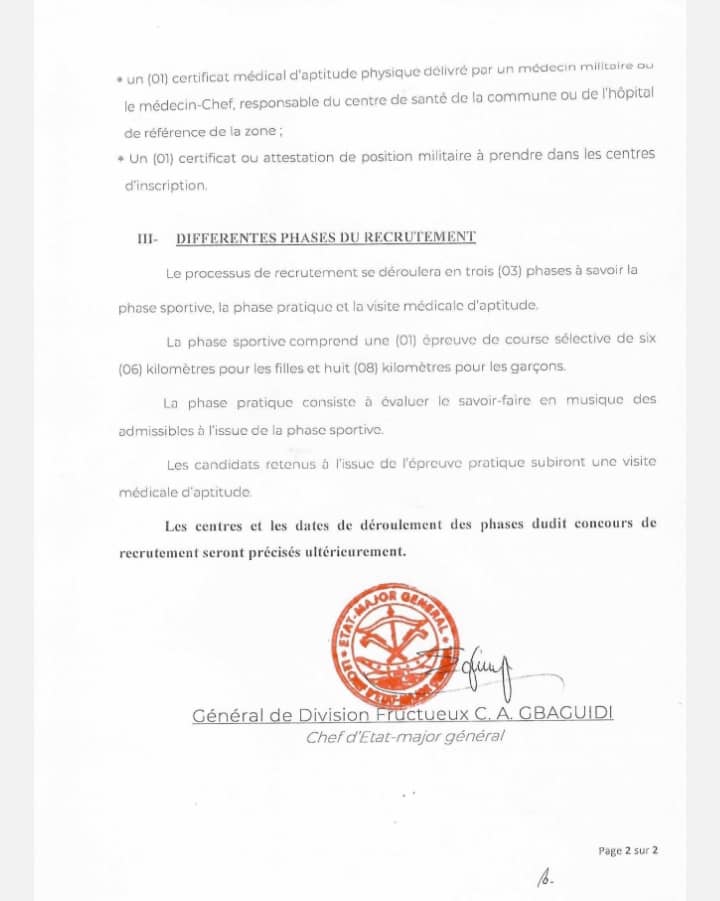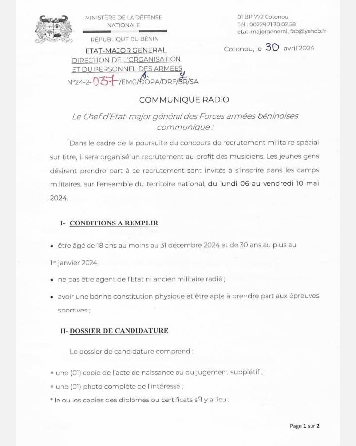 Les jeunes musiciens ont l’opportunité d’intégrer le corps armée. Dans le cadre de la poursuite du concours de recrutement militaire spécial sur titre, il sera organisé un recrutement au profit des musiciens. Les jeunes gens désirant prendre part à ce recrutement sont invités à s’inscrire dans les camps militaires, sur l’ensemble du territoire national, du lundi 06 au vendredi 10 mai 2024. L’annonce a été faite à travers un communiqué daté du 30 avril 2024 et signé par le Général de Division Fructueux C.A. Gbaguidi, Chef d’Etat-major général.