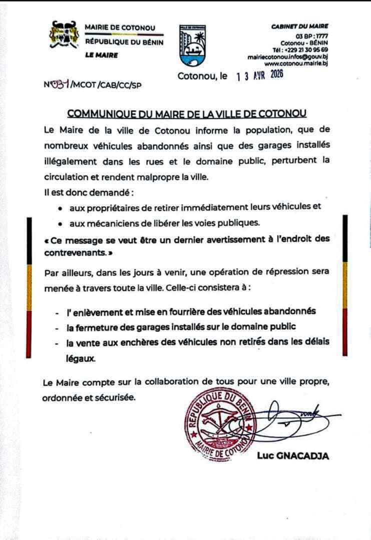 Le maire de Cotonou appelle les propriétaires de véhicules hors d’usage ou abandonnés à les retirer sans délai. Ces engins, souvent stationnés sur la voie publique, contribuent à la congestion du trafic et à la dégradation de l’environnement urbain.