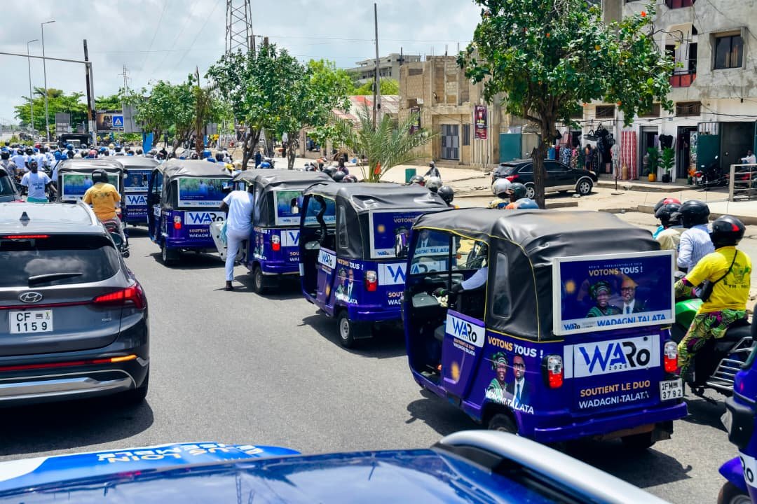 Très vite, les routes se transforment en un fleuve humain et mécanique. Ainsi, plus d’une dizaine de bus, une centaine de zémidjans, des vingtaines de tricycles, plus de 60 véhicules 4×4 et même des quads constituent un dispositif impressionnant, parfaitement orchestré, aux couleurs du duo Romuald Wadagni / Talata. D’ailleurs, depuis le début de la campagne électorale du duo, jamais une caravane d’une telle ampleur n’avait encore été observée.