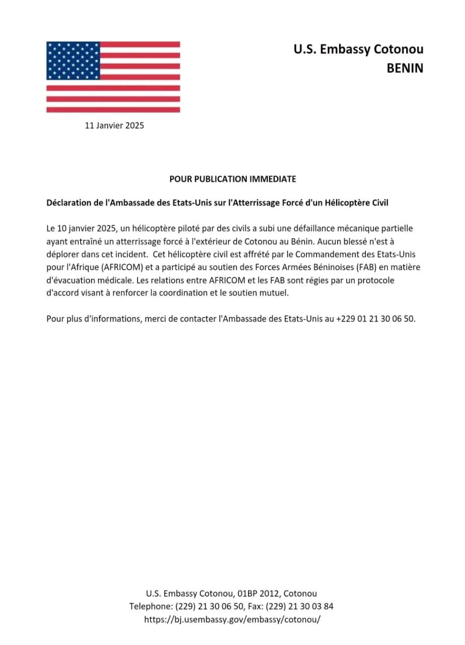 Suite au crash d’un hélicoptère le 10 janvier 2025 à l’extérieur de Cotonou, l’Ambassade des États-Unis a réagi rapidement en apportant des précisions sur l’incident. Selon la déclaration officielle, l’appareil, un hélicoptère civil piloté par des civils, a subi une défaillance mécanique partielle ayant conduit à un atterrissage forcé.