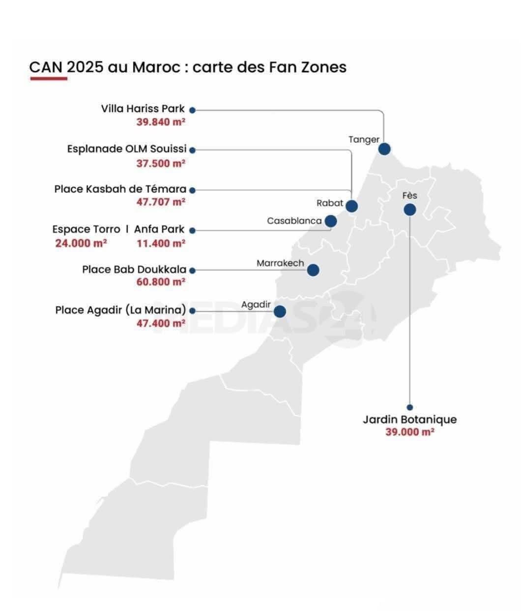 À l’approche de la CAN 2025, sept Fan Zones seront installées dans six villes du Maroc. De Tanger à Agadir en passant par Fès et Marrakech, ces zones accueilleront les supporters dans des lieux emblématiques comme Villa Harris, Bab Doukkala ou la Marina Beach. L’accès sera gratuit pour les porteurs d’un Fan ID.