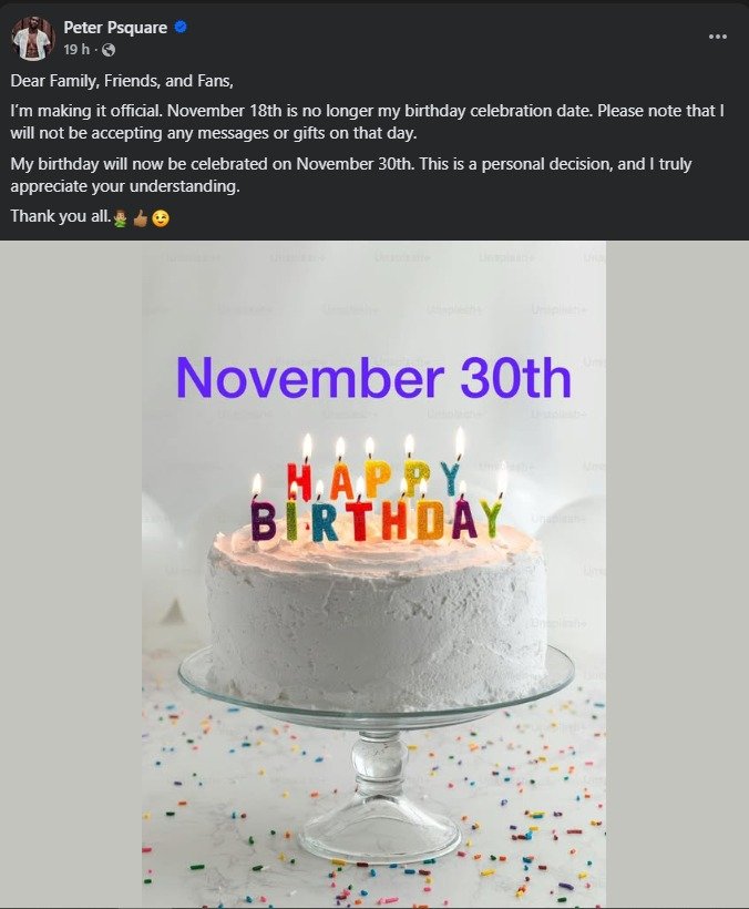 Dans son message, Peter Okoye a clarifié sa position de manière directe : « Mon anniversaire ne sera plus fêté le 18 novembre. Je fêterai désormais mon anniversaire le 30 novembre. »